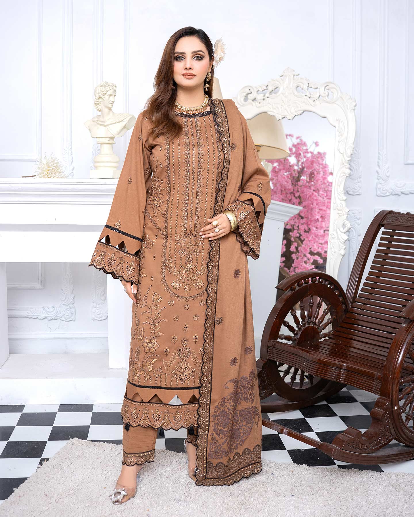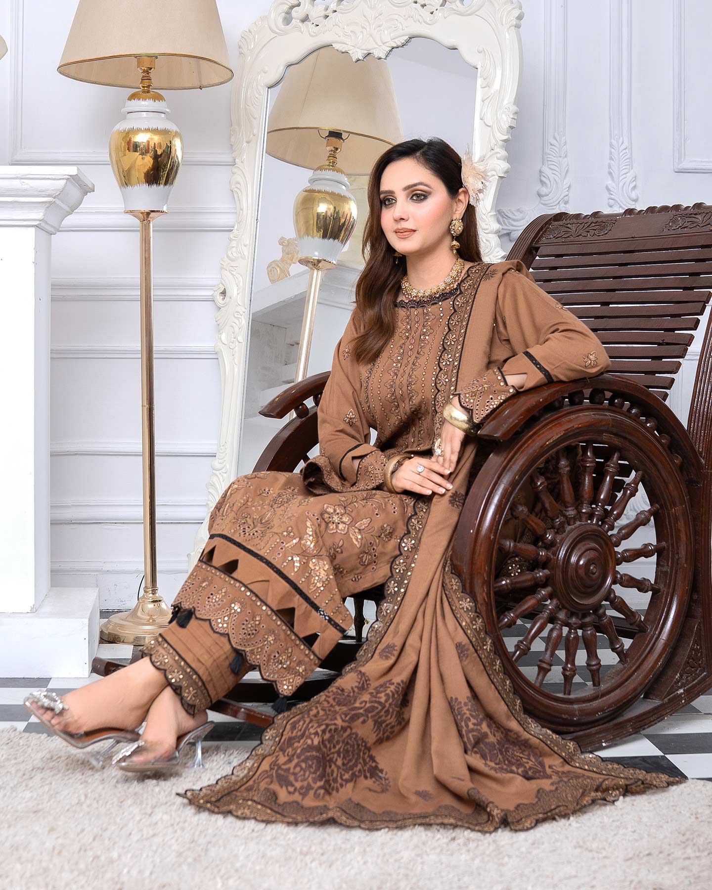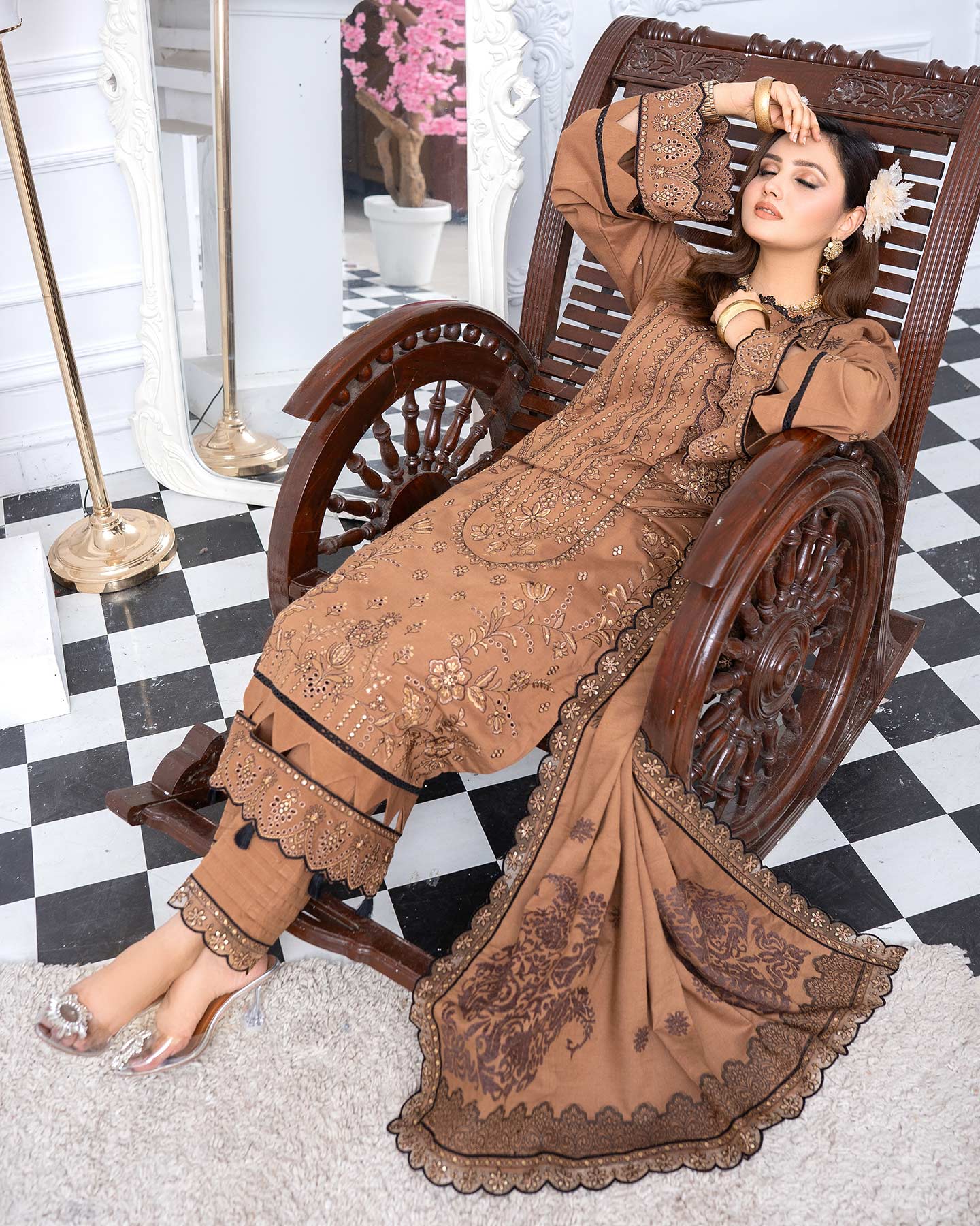 • LUXURY PEACH SLUB MULTI VELVET BROSHA LACE DUPATTA