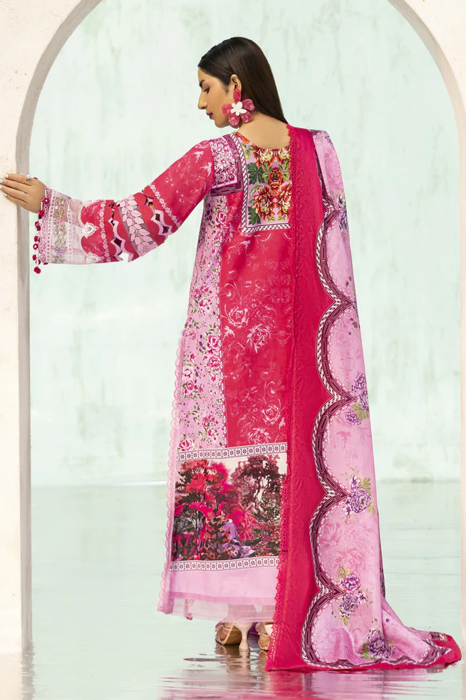 Shirt Digital Printed Lawn Shirt (1 Pc) Embroidered Neckline (1 Pc) Embroidered Front Border (0.84 meters) Embroidered Sleeves Border (0.9 meters) Dupatta Printed Silk Dupatta (2.50 Meter) Trouser Dyed Cambric Trouser (2.50 Meter)